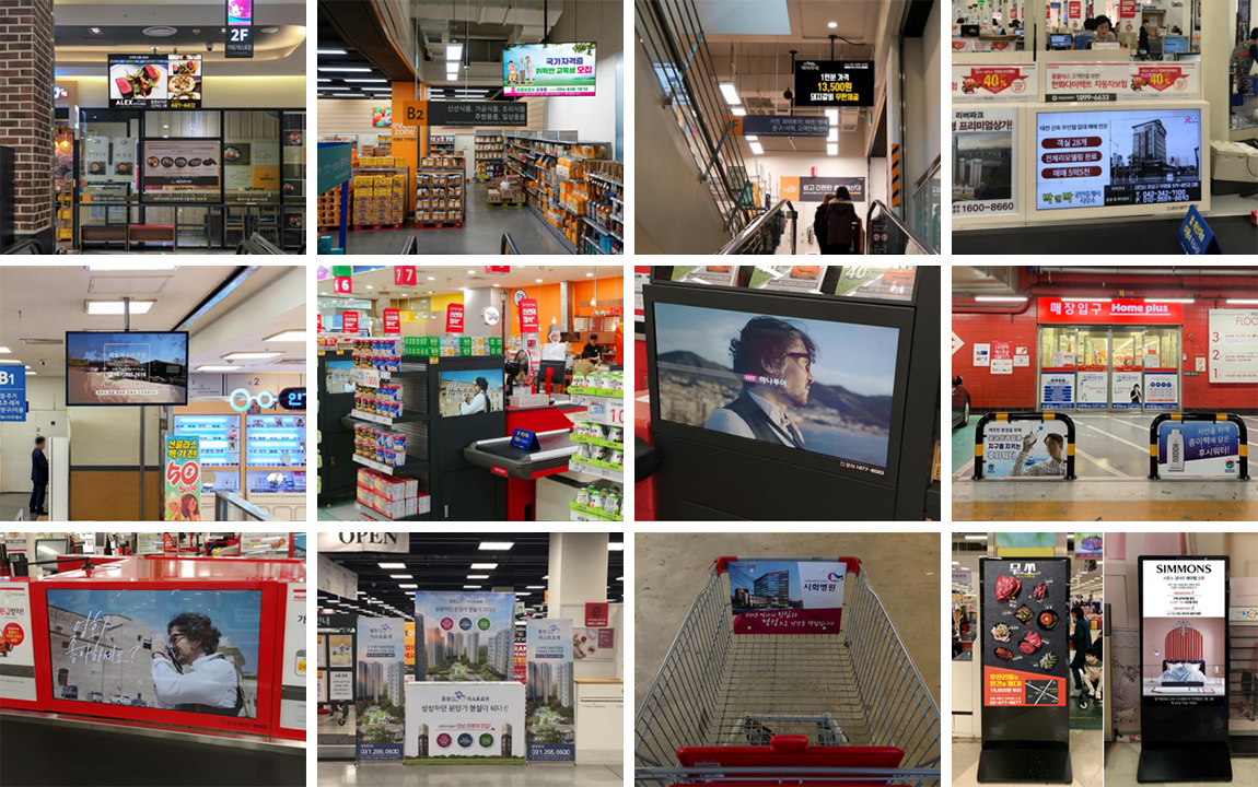 타운보드 TV(KT), 신유통매체인 홈플러스 계산대 UK / FE POS 및 마트 동선 내 슈퍼비전 키오스크, 출입구 자동문 및 안전기둥랩핑 독점 운영 등